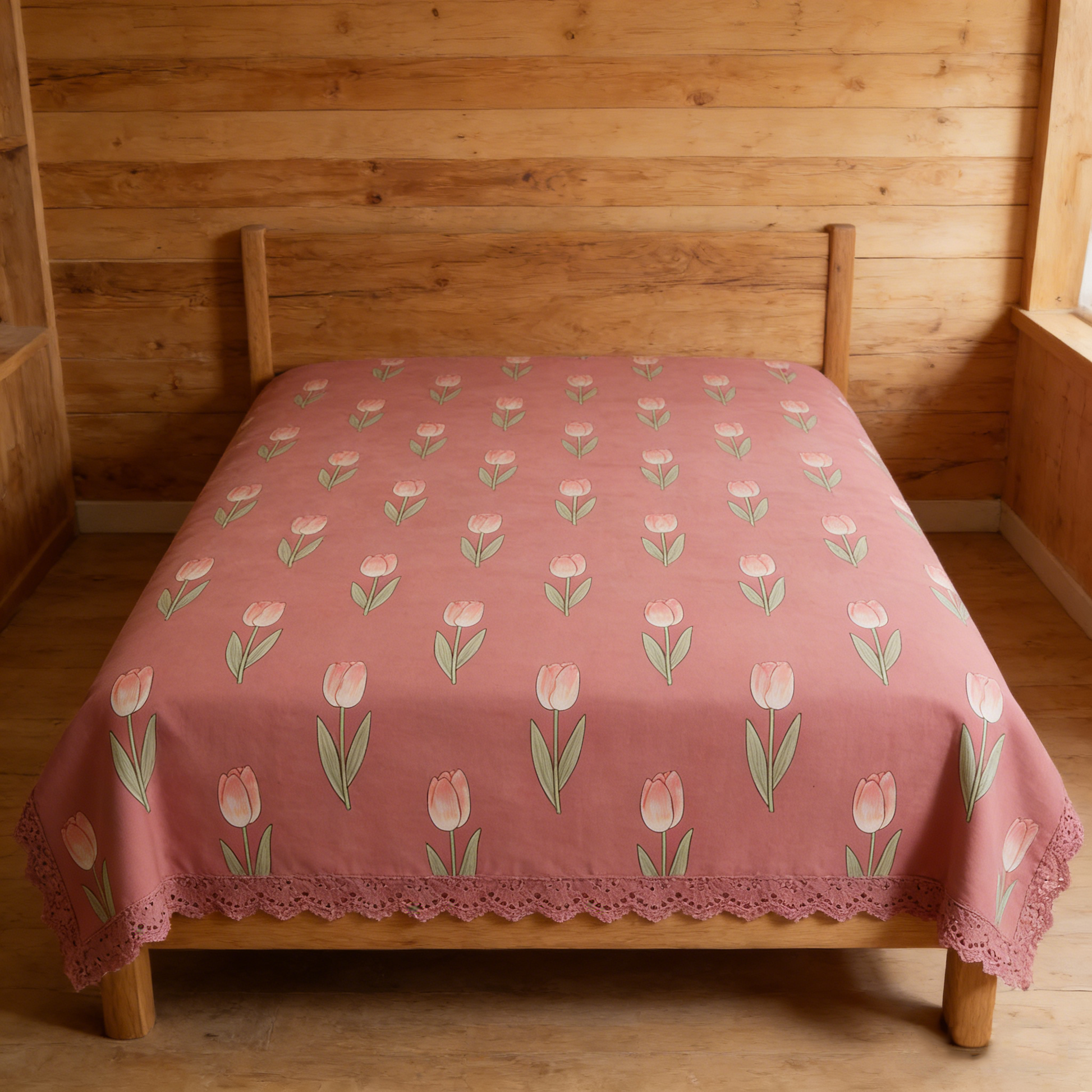 Romantic rose pink bedding with charming tulip prints and lace trim. Creates a feminine, dreamy bedroom atmosphere.