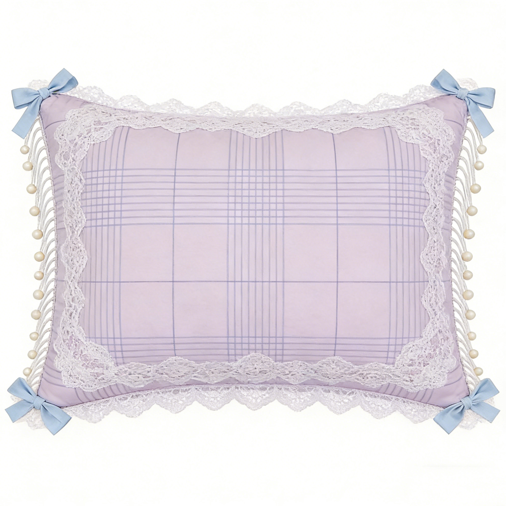 This pillow features a soft lavender plaid, delicate white lace trim, and sweet light blue bows. The pearl tassels add a touch of elegance, making it a charming addition to any cozy space.