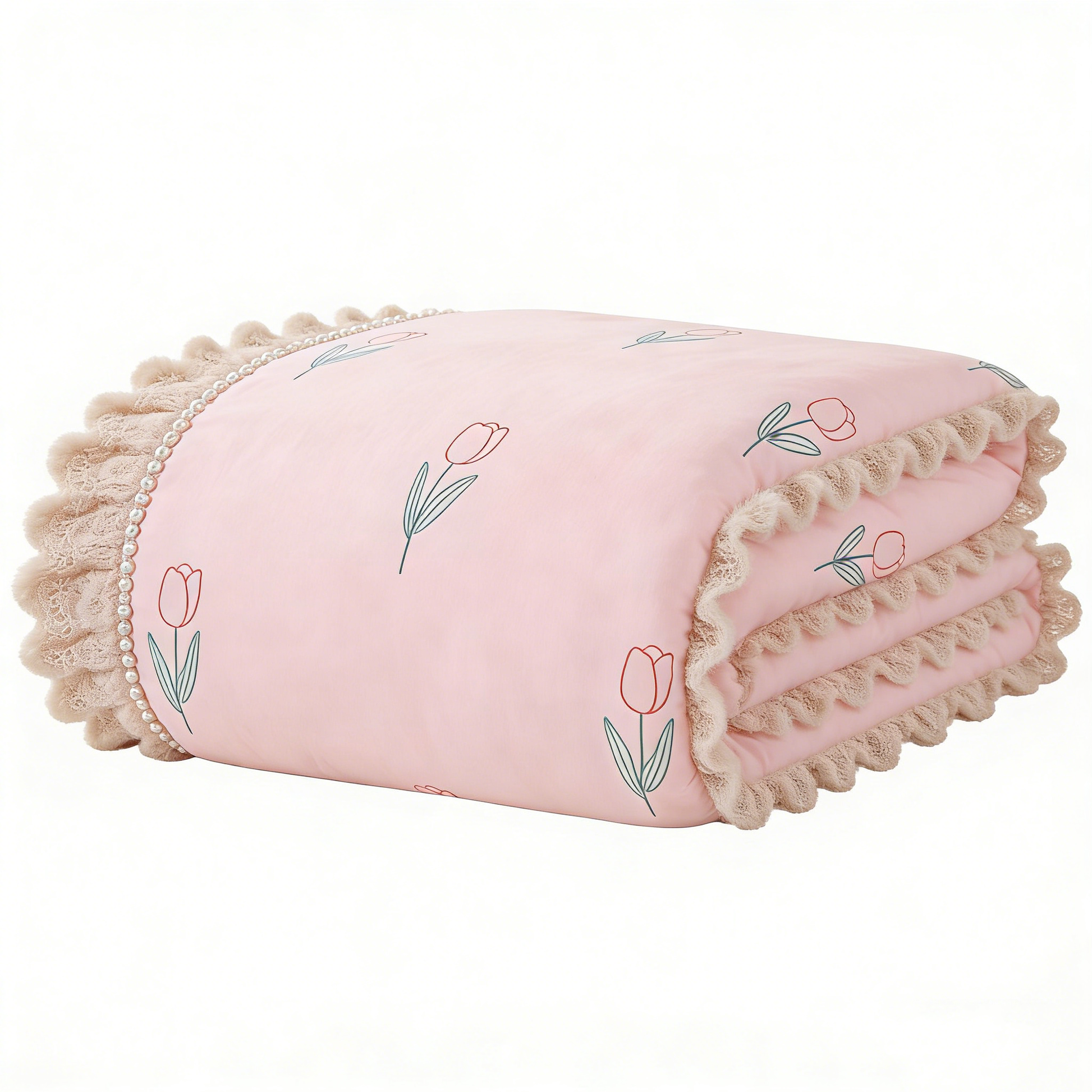 Soft pink blanket with minimalist tulip prints, plush lace trim, and pearl accents for a sweet, feminine bedroom accent.